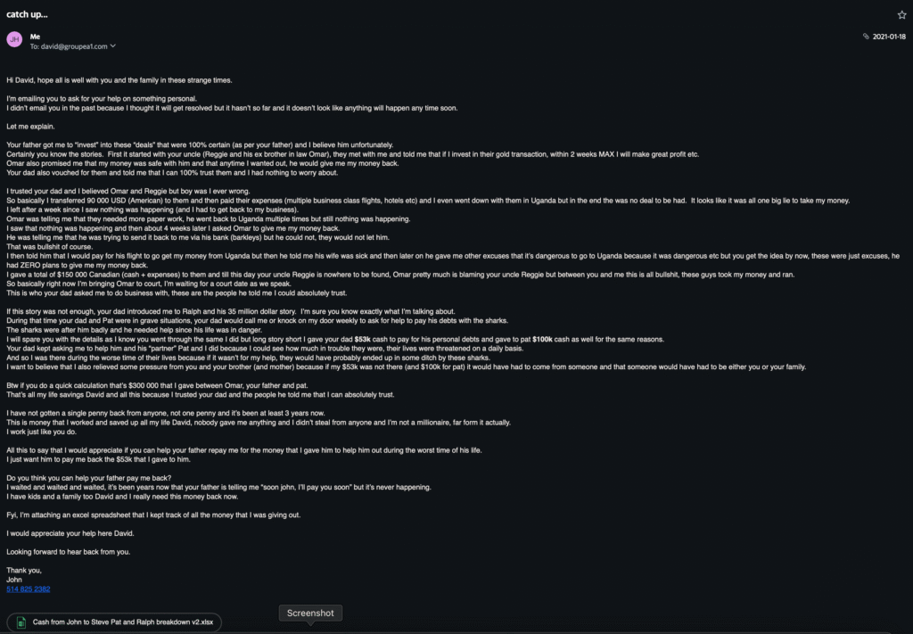 A week turned in to a month, then six months, and eventually a year and I would not see a penny. Throughout this time, he continuously assured me that he would soon come into a fortune, spinning tales about his brother, Reginald (Reggie) D’Souza, a former millionaire with extensive connections and even has a gold mine in Uganda. His repetitive stories filled me with a mix of hope and frustration as I anxiously awaited the return of my $15k. Finally he repaid the $15k but only because I was about to invest 90k usd in his other “gold venture”. Click on the two links below (“gold transaction” and “banking transaction”) to learn more about these two fraudulent schemes that I fell for: