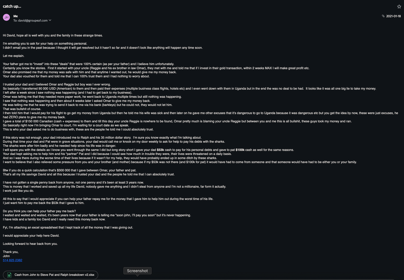 A week turned in to a month, then six months, and eventually a year and I would not see a penny. Throughout this time, he continuously assured me that he would soon come into a fortune, spinning tales about his brother, Reginald (Reggie) D’Souza, a former millionaire with extensive connections and even has a gold mine in Uganda. His repetitive stories filled me with a mix of hope and frustration as I anxiously awaited the return of my $15k. Finally he repaid the $15k but only because I was about to invest 90k usd in his other “gold venture”. Click on the two links below (“gold transaction” and “banking transaction”) to learn more about these two fraudulent schemes that I fell for: